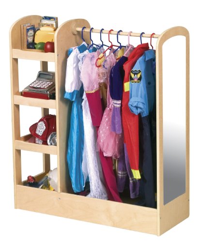 The See and Store Dress-Up Center from Guidecraft is great for the classroom, nursery school or home. This pretend play clothing wardrobe features three storage units on one side for toys, shoes and dramatic play items. A deep bottom with sides and a 1/2-inch diameter hardwood dowel is perfect for hanging clothes and costumes. Theres even an acrylic mirror to enhance dramatic play activities! This sturdy, kids dress-up closet features Baltic birch construction and a clear acrylic topcoat for years of use.